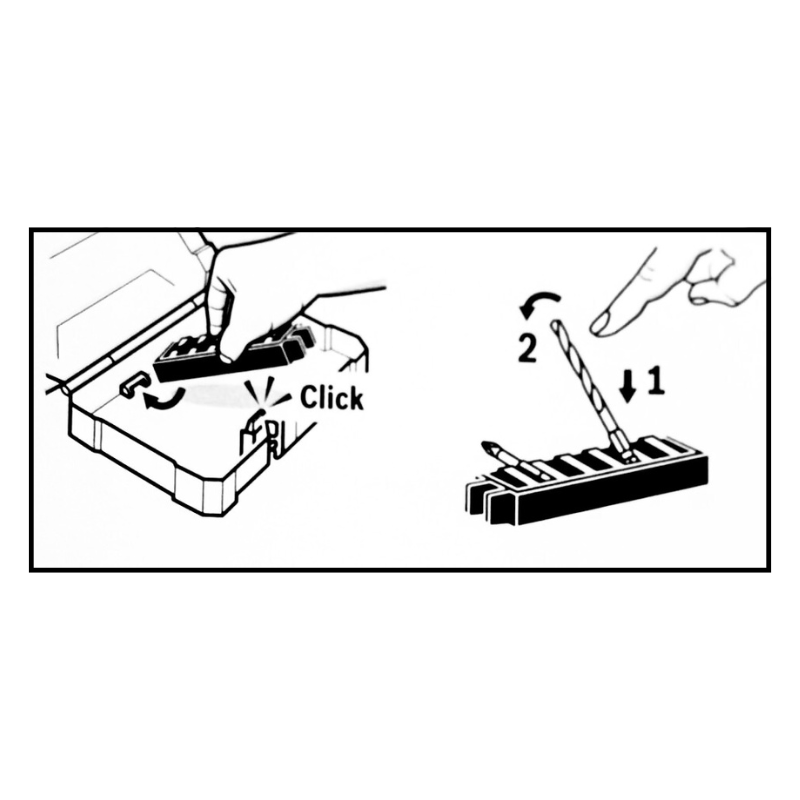 - Click-in system: The bit bundles engage securely in the click slots and you simply need to press the release tab to remove and change these.