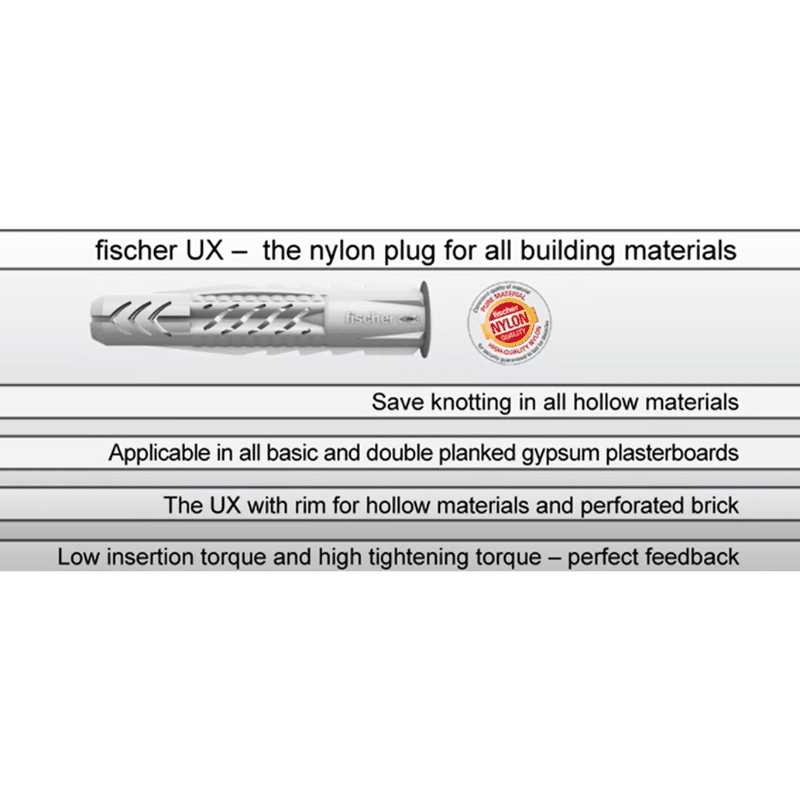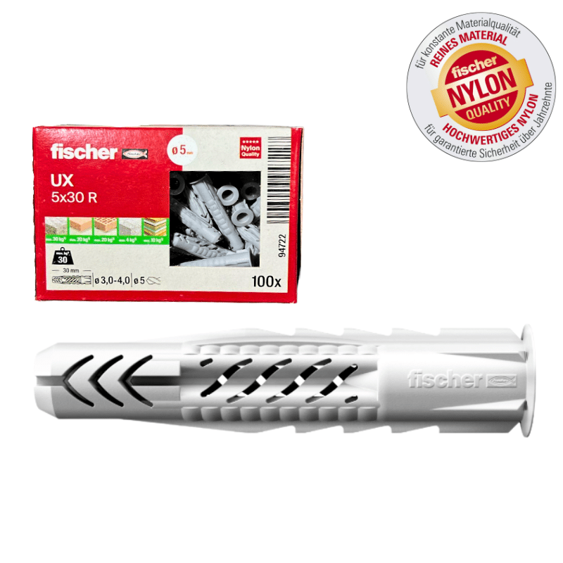 FISCHER 94722, HIGH QUALITY NYLON UNIVERSAL WALL PLUG UX SERIES, 5 x 30MM WITH RIM