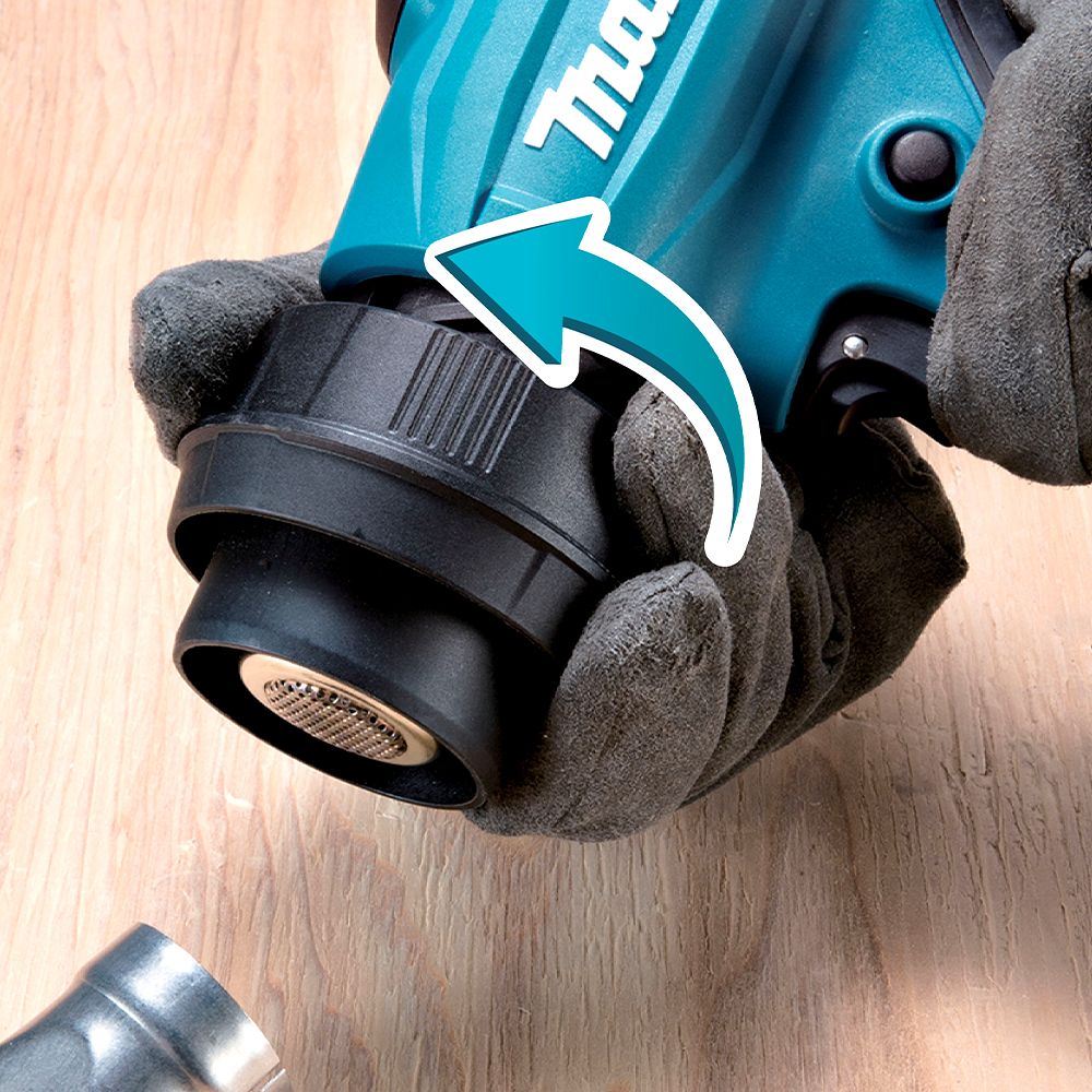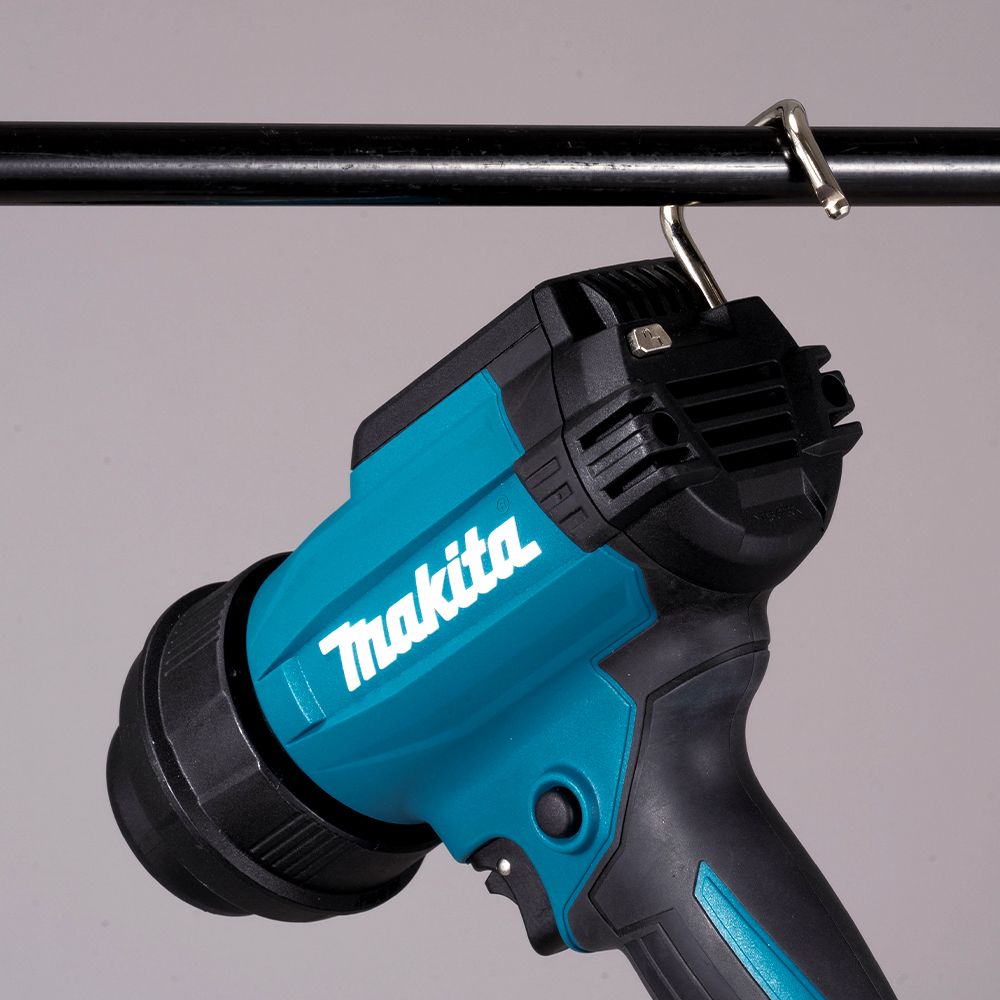 A maximum temperature of 600°C and air volume of 200 L/min, with an added quick-release mechanism allowing for a tool-free nozzle removal without touching hot metal parts for maximum power and efficiency. Maintains constant temperature and airflow by adjusting current as battery voltage drops. Features memory and max temperature control, an LED job light with afterglow, and compatibility with existing DC/AC nozzles for added versatility.